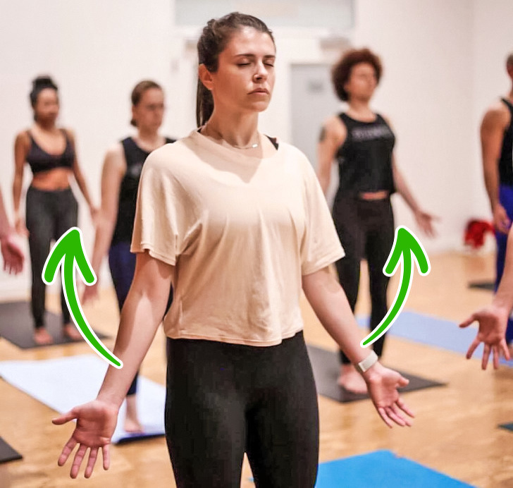 2. Dvíhajte ruky do výšky pliec s dlaňami obrátenými k oblohe tak, aby ste mali jednu pred telom a druhú za telom.