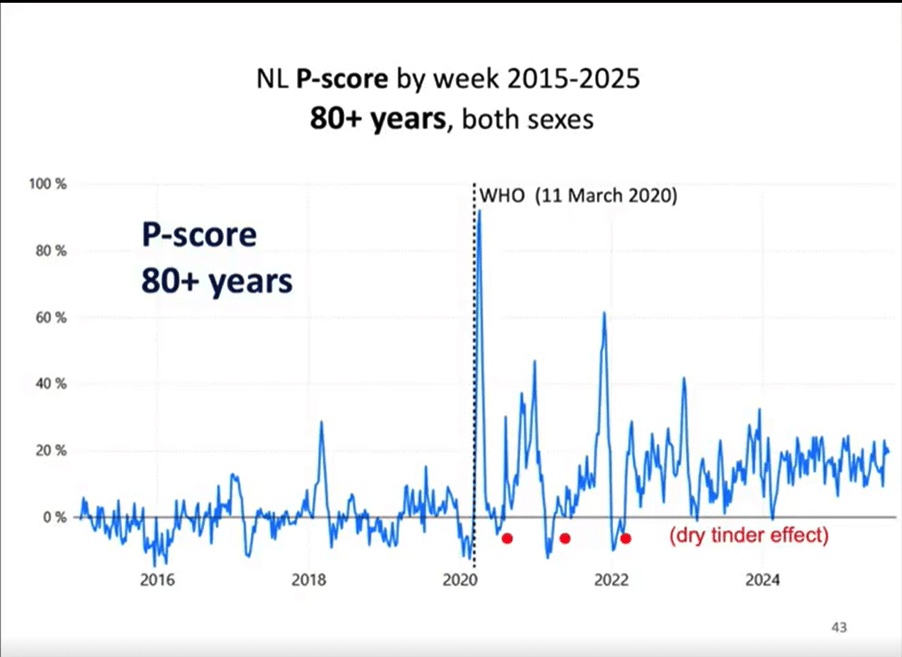 Rancourt ukázal graf týždenných P-skóre od roku 2015 do roku 2025 pre 80 a viac ročných v Holandsku a povedal: