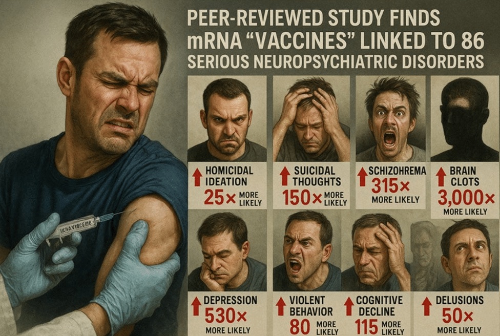 Toto bezprecedentné neurologické poškodenie pomáha vysvetliť, prečo Dr. Thorp a jeho kolektív vedcov zistili, že mRNA injekcie sú spojené s 86 závažnými neuropsychiatrickými poruchami, vrátane demencie, schizofrénie, samovražedných a vražedných myšlienok, mozgovej príhody, psychózy, depresie, kognitívneho poškodenia, bludov a ďalších.